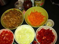 Баклажан и морковь натереть на крупной тёрке. Лук, болгарский перец и помидор мелко порезать. |