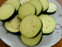 Режем кружками баклажан, присолить. Дать постоять, пока будем делать заправку для гороха. Далее кружки баклажана промыть, обжарить с 2-х сторон на растительном масле. |