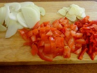 Для заправки: режем лук полукольцами, чеснок - пластинками. Помидор и перец - кубиками. |
