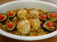 Укладываем в форму голени, по краям - баклажаны, на них - горох с овощами. Сверху накрываем 2 слоем баклажанчиков, на них укладываем половинки помидора или черри (разрезав их пополам) |