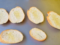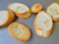 Пока духовка свободна, нарежем багет, смажем кусочки оливковым маслом на чесноке и травах, я брала ароматное масло от вяленых помидоров. И поставим в духовку подрумяниться. |