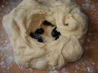 Положите поднявшееся тесто на слегка посыпанную мукой поверхность и аккуратно вмешивайте виноград. |