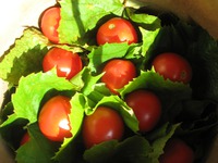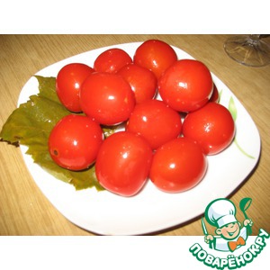Беру мелкие помидоры, здесь у меня сорт "сливка", виноградные листья, тщательно мою холодной водой. |