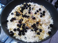 Добавить рис, ягоды черной смородины, перемешать и слегка обжарить. |