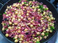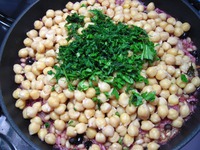Снять с огня сковороду, добавить нут, мелко нарезанную зелень. |