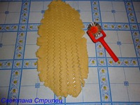Достаем из холодильника оставшееся тесто, раскатываем и вырезаем полосочки для украшения. |