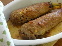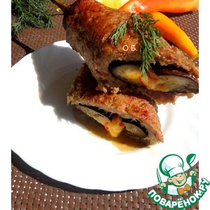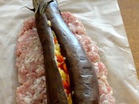 В середину остывшего баклажана укладываем сырную начинку. На пищевую пленку укладываем фарш, на него фаршированный баклажан. С помощью пленки соединяем края. |