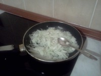 Пока тесто охлаждается, режем две крупные луковицы и ставим их жарить на плиту. Лук должен получиться мягким, слегка золотистого цвета. |