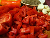 Помидоры выкладываем в кастрюлю и варим. Как только помидоры дали сок, добавляем перец чили и смесь перцев. Варим массу 20 минут. Затем добавляем куркуму и измельченный чеснок и варим еще 10 минут. |