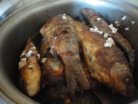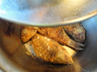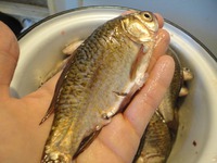 Описание: Увидела вчера на базаре маленьких карасей. Размером 10-12 см. Такие малютки продаются довольно редко, но они самые вкусные, т. к. мясо у них сладковатое. Взяла сразу 2 кг. Мой муж карасей крупнее просто не признает. Эта единственная костистая рыба, которую он ест, но часть проблемы с костями я тоже решила. Приготовила я карасей по рецепту, взятому из журнала "Люблю готовить". Провозилась, конечно, я с ними полдня, но результат того стоил!