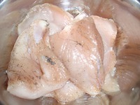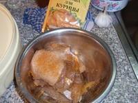 Берём полоски куриного филе, моем и засыпаем соль, перец. Перемешать и поставить в холодильник на 1-2 часа. |