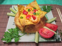 Надрезать омлет сверху крест накрест, отогнуть лепестки. Подавать с соусом в отдельной посуде. |
