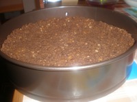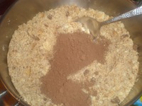 Печенье измельчить. Удобно использовать пакет и скалку. К измельчённому печенью добавить какао, перемешать. Масло растопить, добавить к печенью. Тщательно перемешать. Дать постоять 10 минут. |