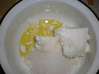 Для начинки творог смешать с размягченным сливочным маслом и сахаром. У меня творог обычно жирный и не влажный. Если у вас творог влажный, добавьте в него столовую ложку крахмала. |