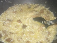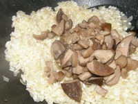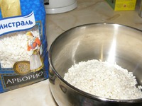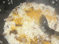 Когда закипит, сделать огонь потише и постоянно помешивать, пока рис не впитает бульон полностью, при этом постоянно подливая к рису бульон. |