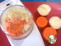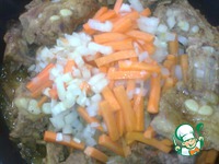 Пока мясо жарится, режем лук мелко и морковь тоненькими брусочками. |