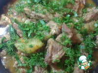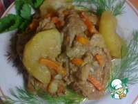 Тем временем яблоки чистим, режем брусочками, через 20 мин. добавляем к мясу и смотрим... |