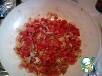 Обжарить лук на растительном масле до золотистого цвета, добавить чеснок, немножко поджарить вместе и добавить мелко нарезанные помидоры |