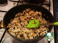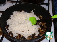 Добавляем рис в сковороду с грибами и луком, солим и перчим по вкусу |
