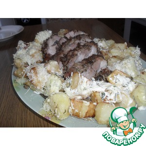 4)Духовку нагреваем до 200 градусов. На противень, смазанный маслом выкладываем наше маринованное мясо, вокруг него очищенный картофель, нарезанный кусочками (перед этим картошку посолить и поперчить) и ставим в духовку на 1 час. Время готовки может быть разное это зависит от духовки. Так что, посматривайте за мясом, но раньше 40 мин. все равно не будет.