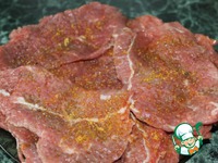 Мясо нарезаем порционными кусками, отбиваем, солим и посыпаем специями. |