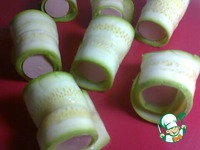 Нарезать сосиски на кусочки (начинка может быть любая, это и отварная говядина, и свинина, и курица, и ветчина). Завернуть каждый кусочек в полоску кабачка. |