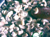 Шампиньоны порезать кусочками и обжарить. К грибам добавить измельченные помидоры ( без кожицы). Посолить и протушить 3 минуты. |