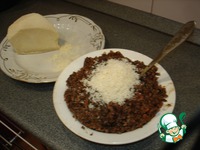 В готовый фарш положите соль и часть натертого Пармиджана. Хорошо перемешайте. |