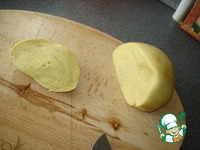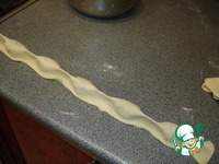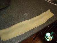 Обрежьте фигурным ножом, как можно ближе к начинке, тесто по всей длине полосы с начинкой. Между начинкой, стараясь удалить воздух изнутри, сплющите тесто. |