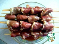 В этом маринаде маринуем около 4 ч. Сердечки, уже промаринованные, нанизать на деревянные шпажки. Убираем запекаться в духовку приблизительно на 30 минут при 180 град. |