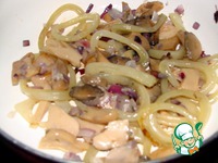 Нарезать кальмара кольцами. В раскаленную сковороду положить лук, чеснок, грибы, кольца кальмара, быстро обжарить. |