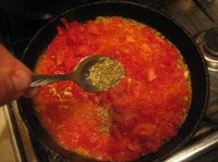 Готовим соус. Помидоры надрезать крест-накрест, ошпарить кипятком, снять кожицу, мелко нарезать. Если используете томаты в собственном соку, то просто открыть банку :) |