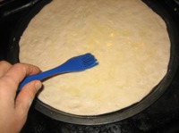 Тесто разделить на 4 части, 3 из них накрыть, чтобы не заветривалось, одну часть ударить об стол, чтобы вышел лишний воздух, можно раскатать, а можно растянуть руками по размерам формы. |