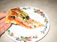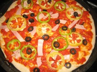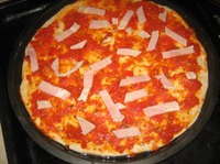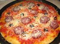 А муж заказал пиццу с салями. Последний кусок теста также раскатываем (растягиваем) и замораживаем на будущее. Можно заморозить вместе с соусом и начинкой. |