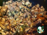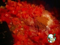 Обжарить подготовленные овощи на среднем огне, затем влить к ним подготовленные помидоры. Добавить соль, сахар и чёрный перец по вкусу, перемешать и прогреть минут 5-10. |