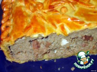 6. Накрыть начинку крышкой из теста. Влажными руками защипать края, лишнее тесто отрезать ножницами. Из остатков теста вырезать листики и украсить ими верх паштета. |