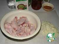 Разрезаем каждое крылышко на три части по суставам. Самые маленькие не нужны. Лук нарезаем кубиками (не очень мелко). |