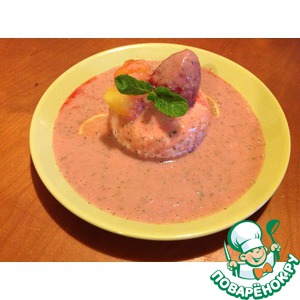 Итак, соус: замороженные ананас и клубнику кладем в стакан, размораживаем в микроволновой печке. Добавляем туда мяту, кефир и измельчаем тщательно в блендере.
