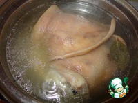 Для начала чистим и отвариваем уши в подсоленой воде с добавлением лаврового листа, перца горошком, гвоздики 2 часа. У меня они были сварены еще вчера, одно ухо съедено сразу...))) |