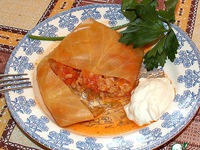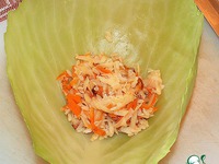 Делим капусту на листья, бланшируем в кипящей подсоленной воде. Кладем на каждый листик начинку, |