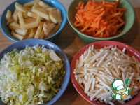 Сельдерей и морковь очистить и нарезать соломкой. Картофель очистить и нарезать брусочками. Лук-порей измельчить. |