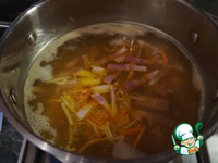 Добавить в суп зажарку вместе с грудинкой, приправить солью, варить 10 минут. |