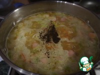 Всыпать в суп сосиски, добавить лук-порей и листики майорана, варить 3 минуты. |
