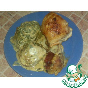 Когда все готово, выкладываем на тарелку: ваша любимая часть курочки и тесто.