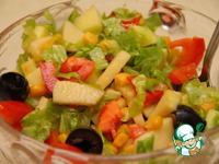 Порезать помидор, 4-5 листьев салата, разрезать маслины пополам, добавить яблоки, кукурузу и смешать все ингредиенты. |