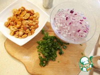 Лук красный (у меня ялтинский) мелко режeм, и я его заливаю кипятоком на минут 5, этого делать не обязательно. Зеленый также режем мелко. Опята промываем от маринада. |