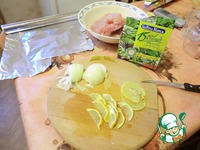 Нам понадобятся лук, лимон, курица, зелень (свежая или сушеная), а также фольга и зубочистки. |