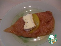 Приступаем к формированию рулетиков. На мясо выкладываем кусочек персика и кусочек сыра. |
