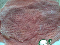 Начинку кладем на кусочки мяса и заворачиваем конвертики. |