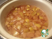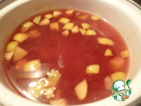 Добавляем отцеженый вначале клюквеный сок и хорошо перемешиваем. Тут яблоки еще крутятся после перемешивания, поэтому фотка вышла слегка размытой. |